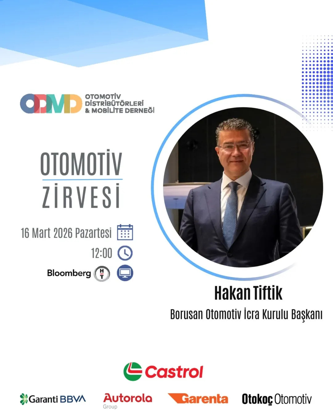 Otomotiv Distribütörleri ve Mobilite Derneği (ODMD) tarafından sektörden ve paydaş sektörlerden birçok yöneticinin katılımıyla düzenlenen ve Bloomberg HT TV kanalında yayınlanan Otomotiv Zirvesi programına 16 Mart Pazartesi günü Borusan Otomotiv İcra Kurulu Başkanımız Hakan Tiftik konuk olmuştur.